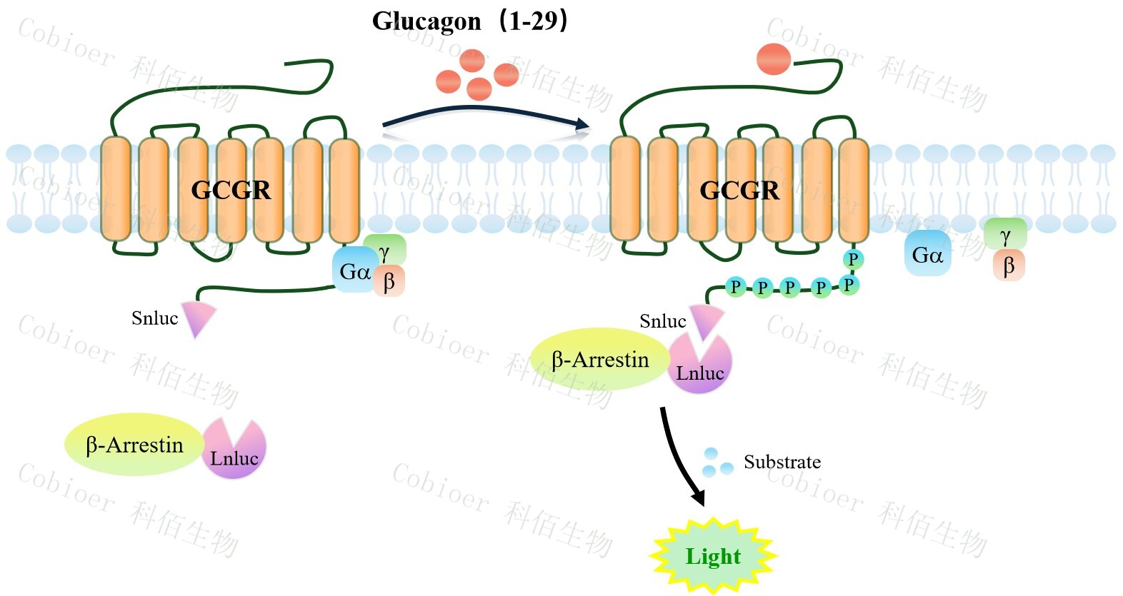 GCGR β-Arrestin CHO 報(bào)告基因藥靶模型很好的模擬了體內(nèi) GCGR/β-Arrestin 的信號(hào)轉(zhuǎn) 導(dǎo)過程,原理見下圖所示。當(dāng)缺乏配體刺激時(shí),β-Arrestin 不與 GCGR 結(jié)合,融合β- Arrestin 的熒光素酶處于失活構(gòu)象;當(dāng) GCGR 遭遇配體刺激時(shí),融合熒光素酶報(bào)告基因的β- Arrestin 被招募,使熒光素酶報(bào)告基因處于激活狀態(tài),加入其底物后發(fā)光信號(hào)增強(qiáng)。![]() Figure 1. GCGR β-Arrestin CHO 細(xì)胞模型原理圖 |
