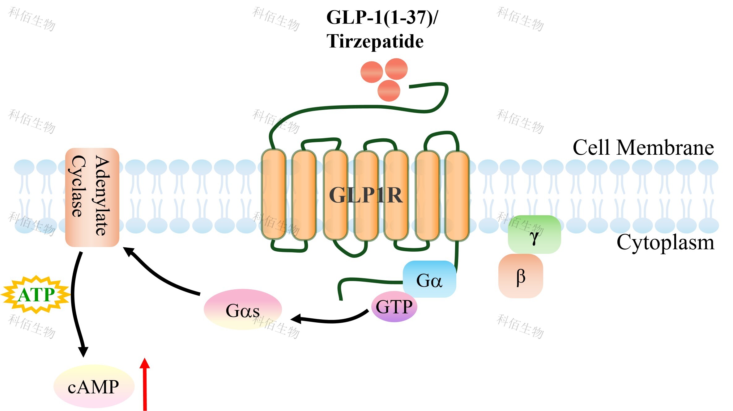 GLP-1R 的內(nèi)源性配體是 GLP-1 (7-36)和 GLP-1 (7-37),它們是胰高血糖素原翻 譯后加工的產(chǎn)物。GLP-1R 主要通過 Gαs/cAMP 通路發(fā)出信號(hào),直接導(dǎo)致葡萄糖誘導(dǎo)的胰 島素顆粒分泌;但有證據(jù)表明 GLP-1R 可與 Gαq 和其他 G 蛋白偶聯(lián);GLP -1R 激活后,C 末端發(fā)生磷酸化,進(jìn)一步募集β-抑制蛋白,導(dǎo)致受體內(nèi)化和脫敏。