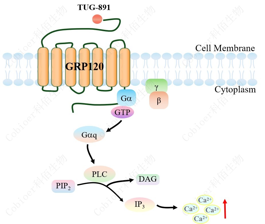 GPR120 可以耦合到多個傳感器(Gq、Gi、Gs 和 β-arrestins)來介導不同的下游信號 傳導。 GPR120 激動劑,包括內源性飽和 9-羥基硬脂酸(9-HSA)、不飽和亞油酸(LA, ω-6 FA)和油酸(OA,ω-9 FA)、天然產物二十碳五烯酸(EPA,ω-3 FA)和合成激動劑 TUG891。TUG891 有明顯的 Gq 偏向活性,只有 EPA 可以激活 Gs 信號。