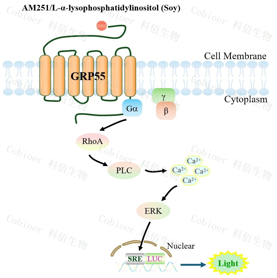 GPR55 Reporter Cell 藥靶模型很好的模擬了體內(nèi) GPR55 的信號轉(zhuǎn)導(dǎo)過程,原理見下圖所示。 ![]() Figure 1. GPR55 Reporter Cell 細(xì)胞模型原理圖 |