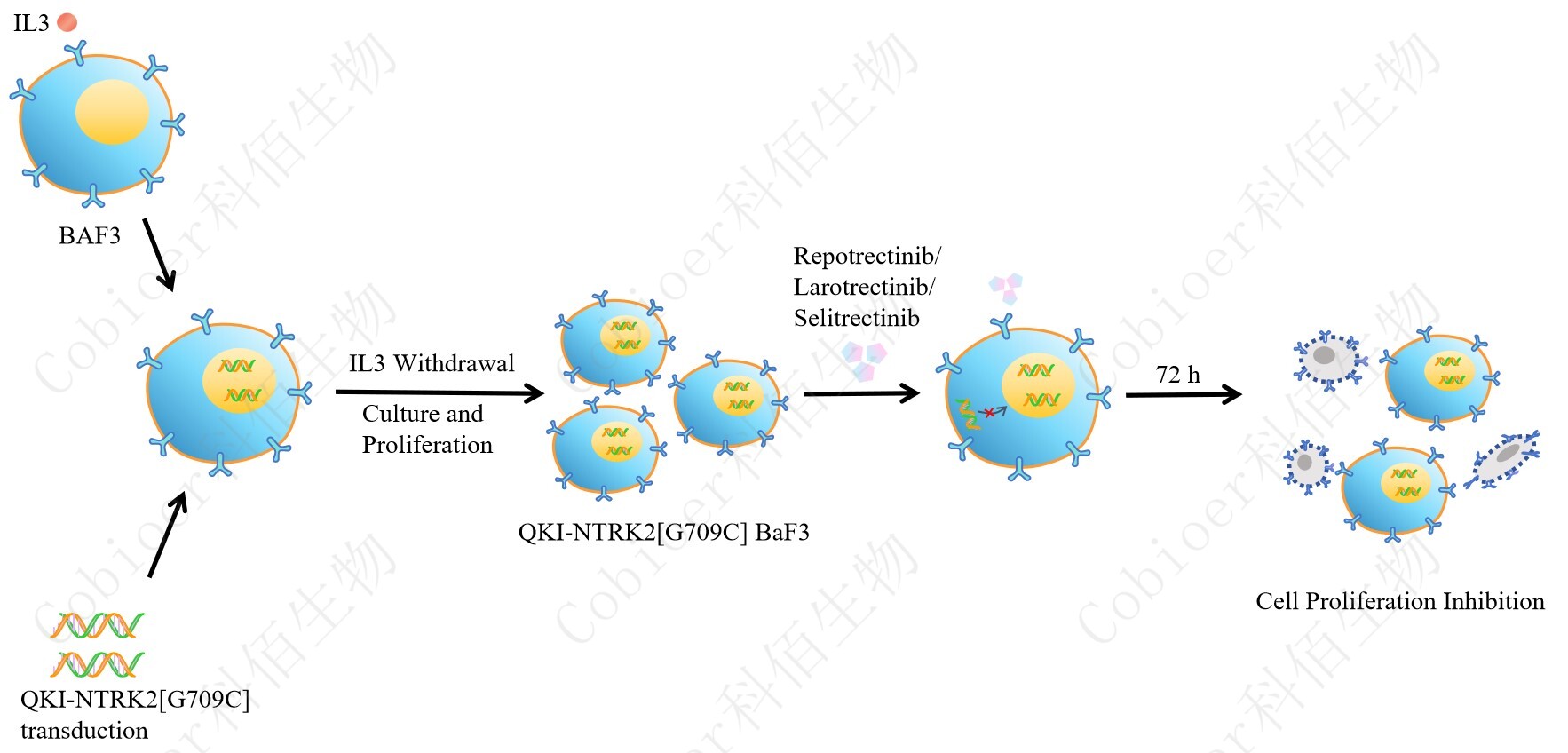 BaF3(小鼠原 B 細胞)的生長和增殖需要 IL-3 的維持。通過引入各種表達激酶的基因, 能作為 BaF3 的驅(qū)動基因,讓 BaF3 不再依賴 IL-3 而增殖,進而激酶基因成為 BaF3 增殖依 賴的驅(qū)動基因,用于評估小分子藥物對激酶的靶向抑制作用,原理及流程見下圖所示。