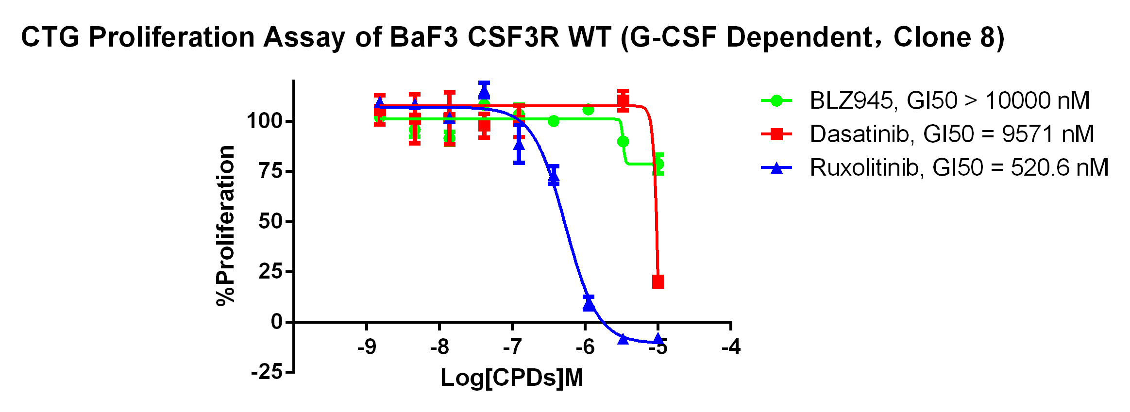 Figure 2. Anti-proliferation assay of three reference compounds on the CSF3R WT/BaF3. |