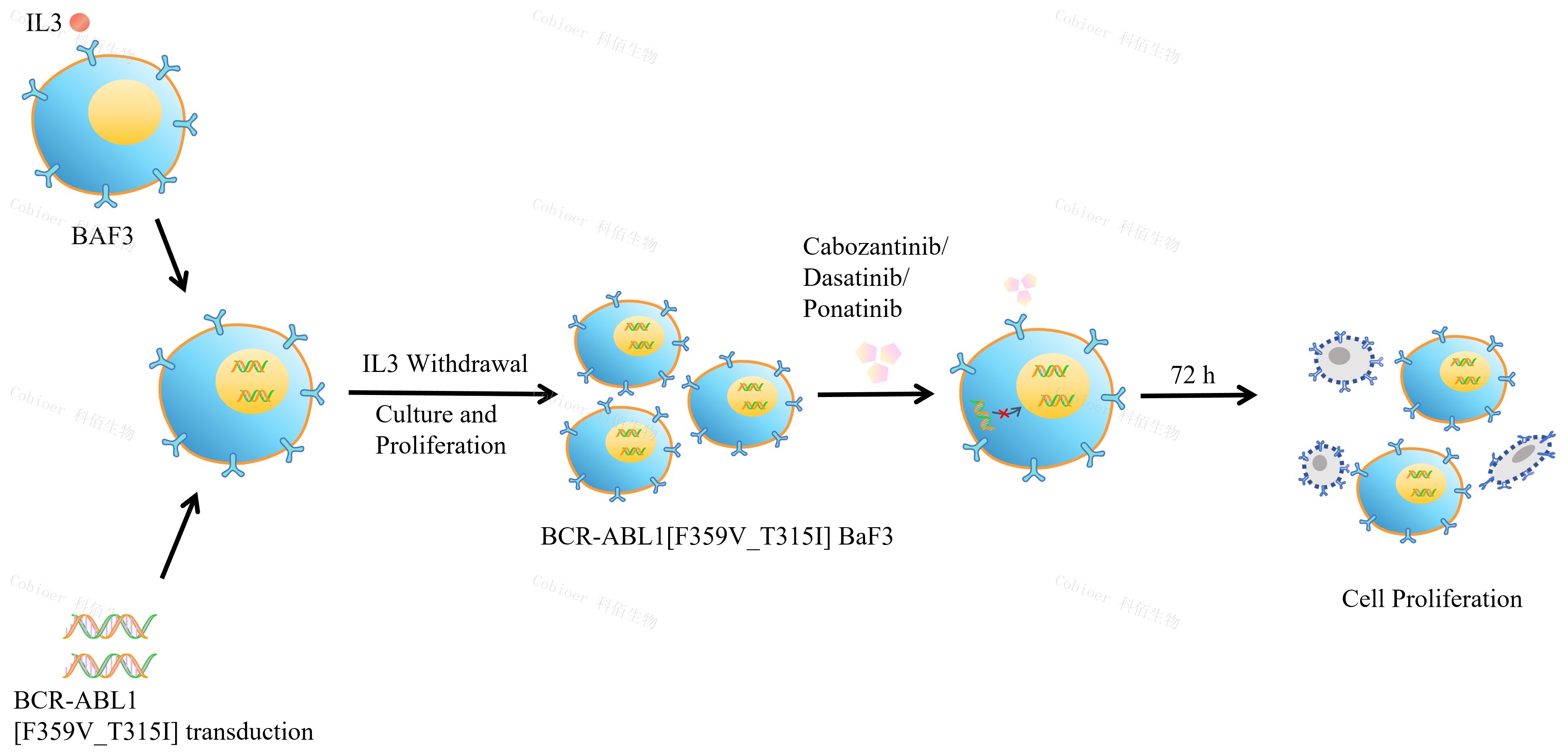 BCR-ABL1[F359V_T315I] BaF3 藥靶細(xì)胞,通過(guò)轉(zhuǎn)導(dǎo)突變狀態(tài)的 BCR- ABL1[F359V_T315I] 基因到 BaF3 細(xì)胞系中 , 穩(wěn)定表達(dá)人突變形態(tài)下的 BCR- ABL1[F359V_T315I]基因。