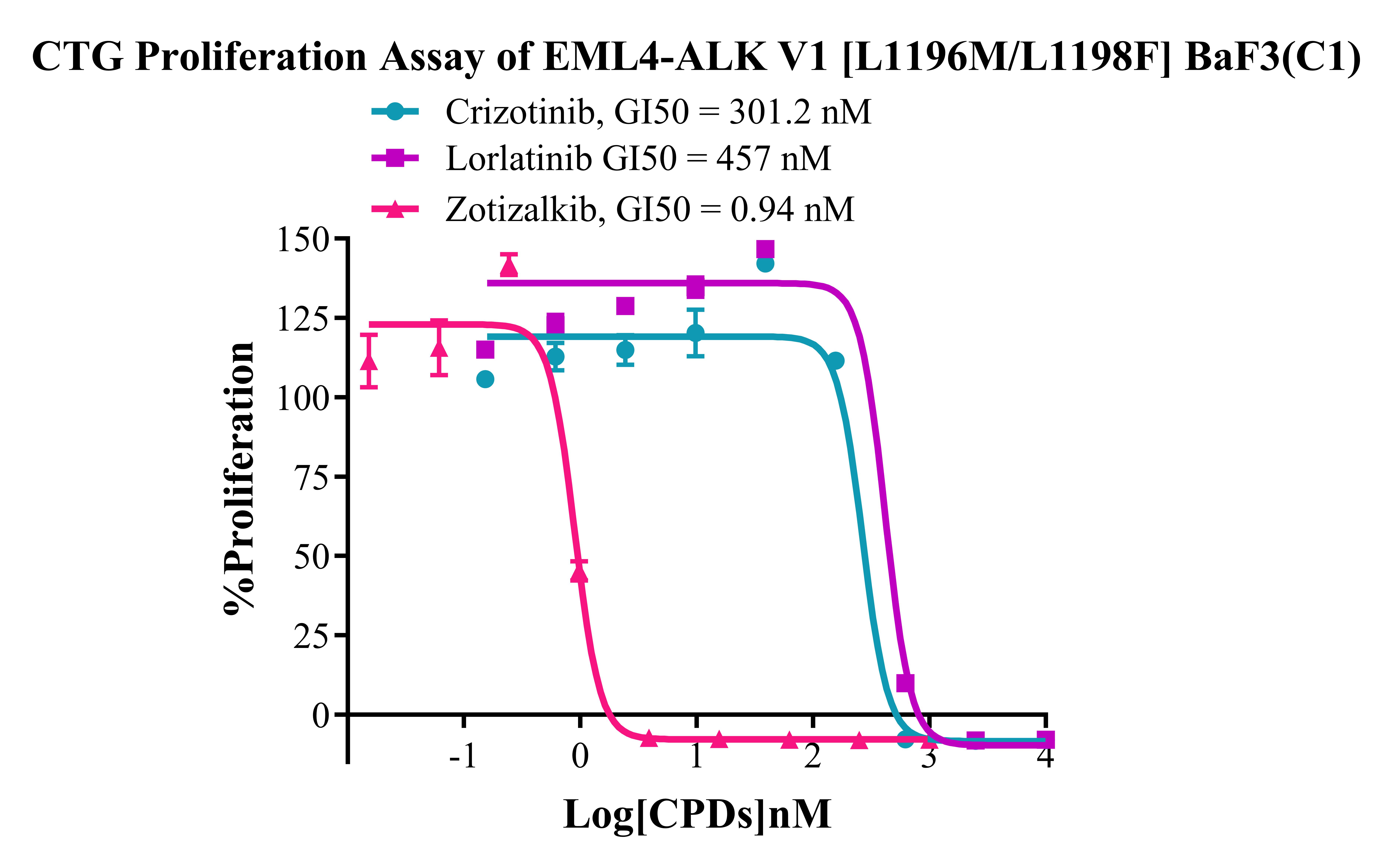 Figure 4. CTG Proliferation Assay of EML4-ALK V1 [L1196M/L1198F] BaF3(C1). |
