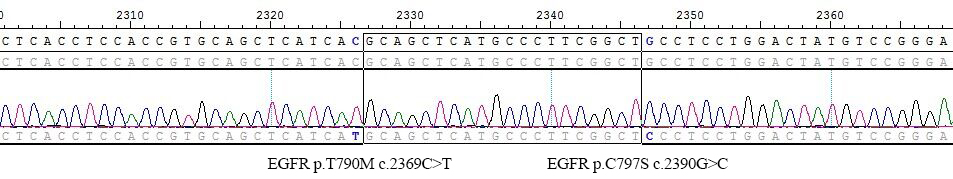 Figure 2. Sanger of EGFR p.T790M c.2369C>T、EGFR p.C797S c.2390G>C