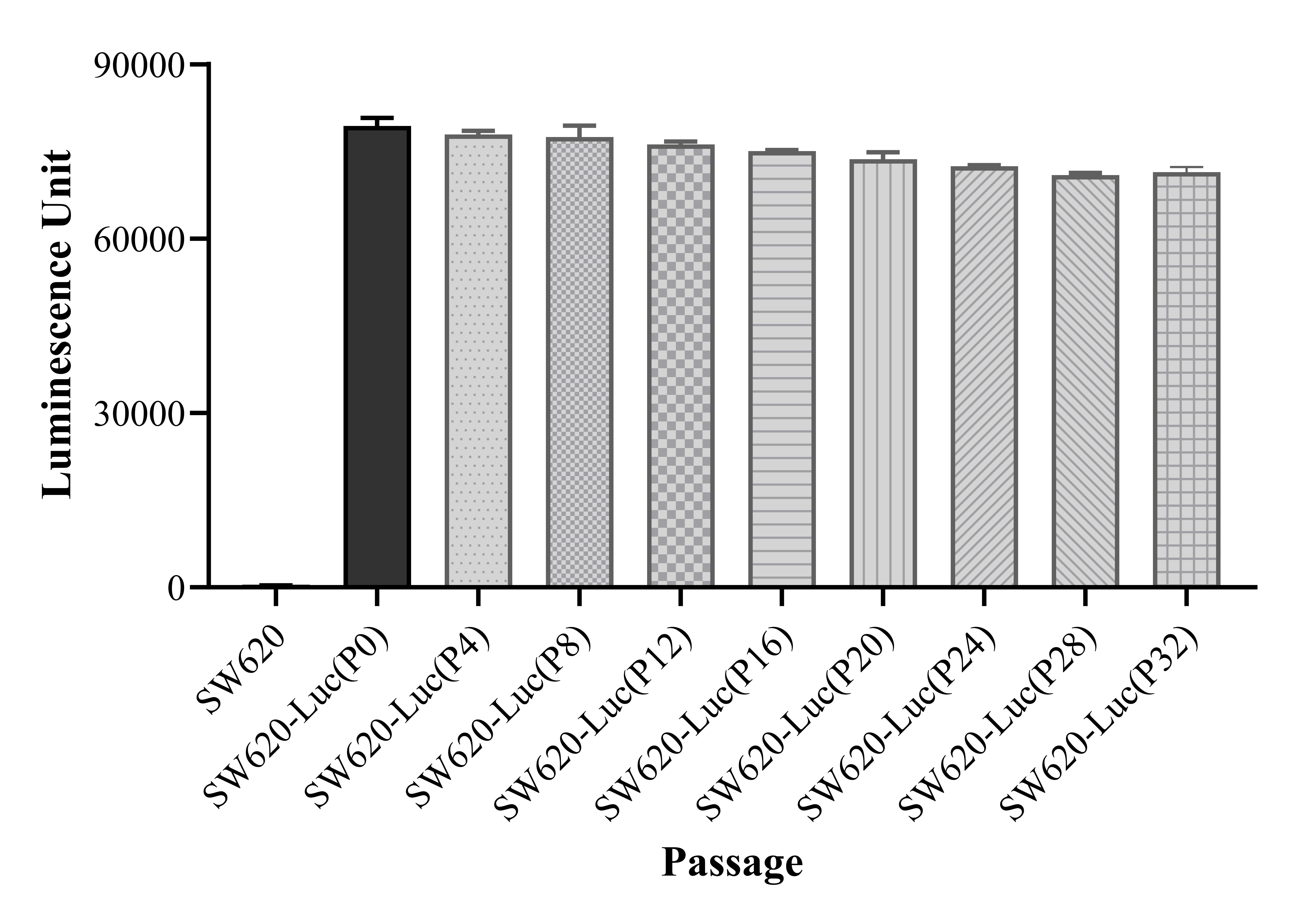 Figure 1. Stablity test results. SW620-Luc cell showed at least 32 passage stability with similar luminescence unit.