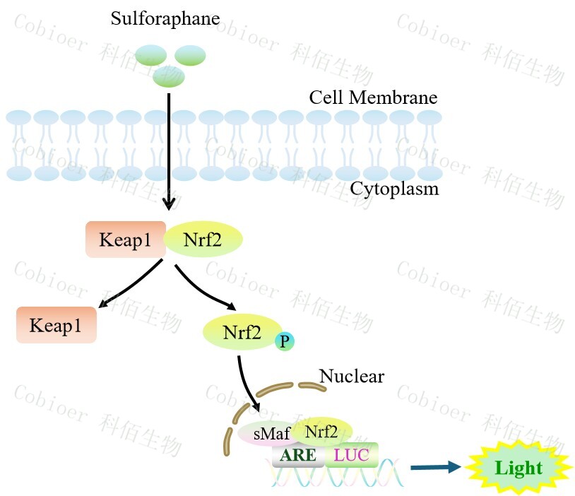 ARE-Luc(Nrf2 Antioxidant Pathway) HEK293 報告基因細胞,是由 ARE 調(diào)控并表達 Luc 熒光素酶報告基因的 HEK293 細胞。Sulforaphane 是 Keap1/Nrf2/ARE 的誘 導(dǎo)劑,原理見下圖所示。![]() Figure 1. ARE-Luc(Nrf2 Antioxidant Pathway) HEK293 細胞模型原理圖