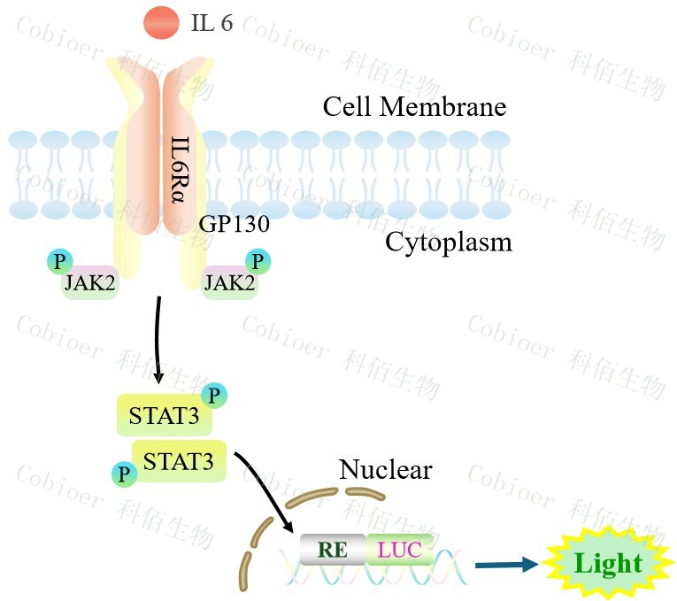 STAT3-Luc HEK293 報(bào)告基因細(xì)胞,是由 STAT3 調(diào)控并表達(dá) Luc 熒光素 酶報(bào)告基因的 HEK293 細(xì)胞。IL6 細(xì)胞因子與受體復(fù)合物結(jié)合,啟動(dòng) JAK/STAT3 信號(hào)通路,原理見(jiàn)下圖所示。