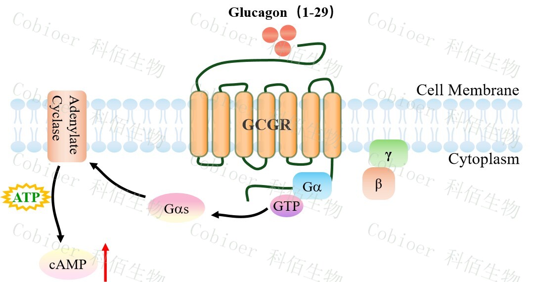 | 胰高血糖素是一種胰腺肽激素,作為胰島素的反調(diào)節(jié)激素,刺激葡萄糖通過肝臟釋放, 維持葡萄糖穩(wěn)態(tài)。GCGR 是一種 B 類 GPCR,最初被描述為與腺苷酸環(huán)化酶功能相連的胰 高血糖素結(jié)合體。它在維持葡萄糖穩(wěn)態(tài)中起關(guān)鍵作用,因此被認(rèn)為是治療糖尿病的一個有 價值的靶點(diǎn)。 GCGR 的天然配體是胰高血糖素。胰高血糖素與受體結(jié)合激活 Gs 蛋白,從而激活腺苷 酸環(huán)化酶。GCGR 受體與天然配體胰高血糖素結(jié)合調(diào)節(jié)體內(nèi)葡萄糖穩(wěn)態(tài),是Ⅱ型糖尿病的 重要藥物靶點(diǎn)。 |