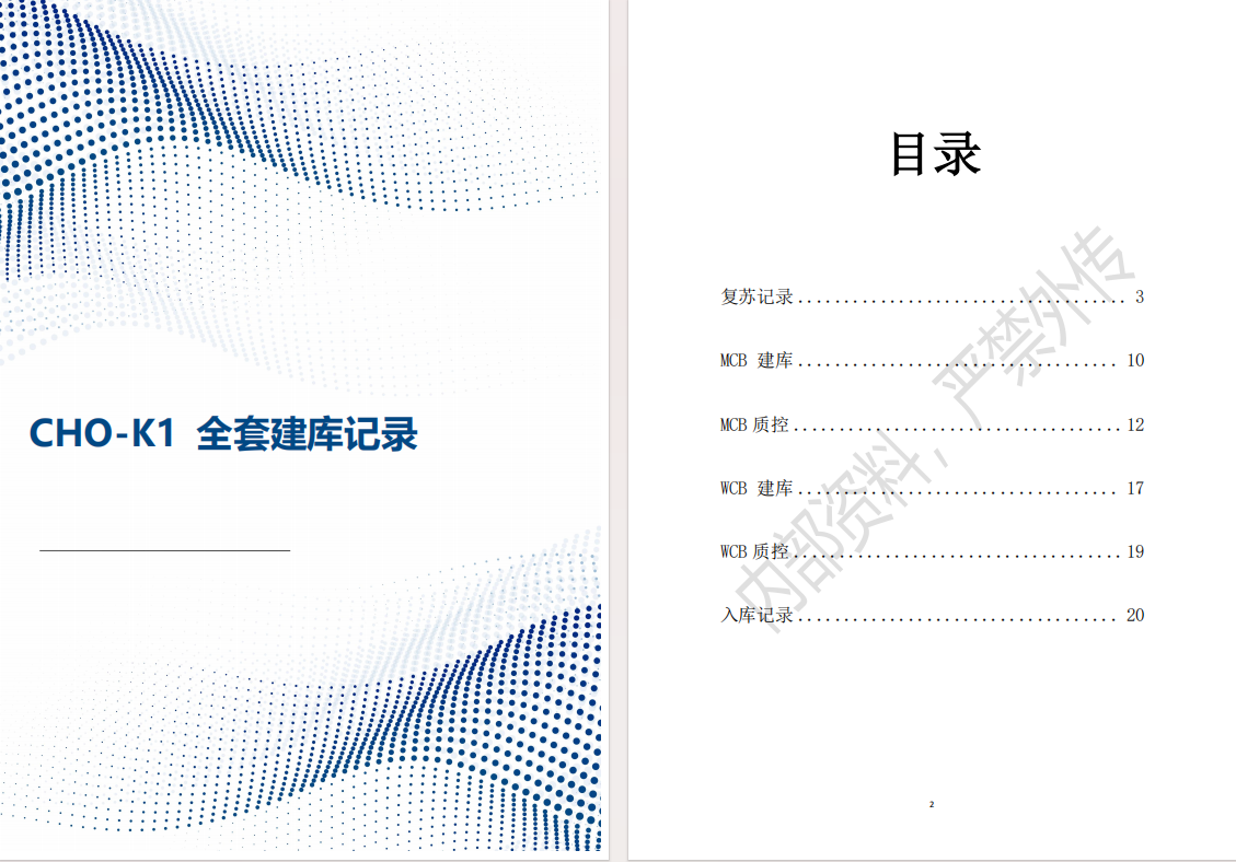 全套建庫記錄:復(fù)蘇記錄→MCB建庫→MCB質(zhì)控→WCB建庫→WCB質(zhì)控→入庫記錄,形成從細(xì)胞復(fù)蘇、主細(xì)胞庫(MCB)到工作細(xì)胞庫(WCB)的全套建庫操作記錄,保證工藝鏈條完全可追溯與質(zhì)量可控。