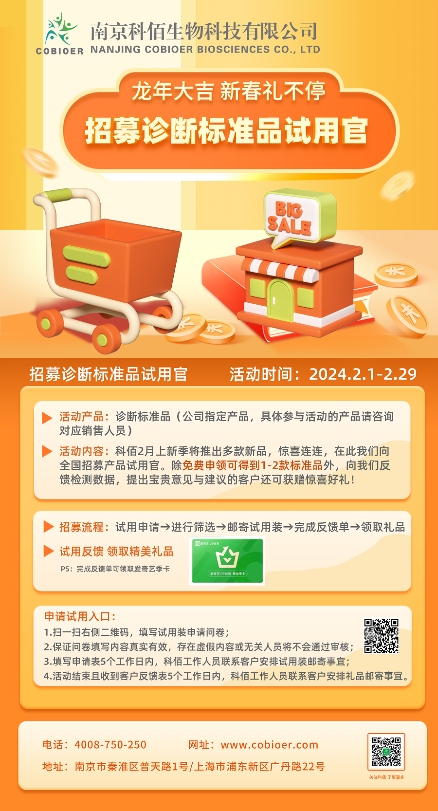 科佰生物2月上新季將推出多款新品,驚喜連連,在此我們向全國招募產品試用官。除免費申領可得到1-2款標準品外,向我們反饋檢測數(shù)據(jù),提出寶貴意見與建議的客戶還可獲贈驚喜好禮!