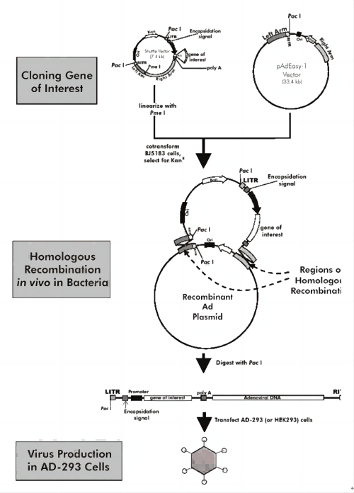 AdEasy包裝系統(tǒng)主要的特點是利用Cre/loxP系統(tǒng)在大腸桿菌(BJ5183)中完成外源基因插入腺病毒基因組的過程,獲得環(huán)狀的重組腺病毒基因組,并且具有在細菌中復制的必需元件。將重組腺病毒基因組酶切線性化后轉(zhuǎn)染HEK293細胞,避免了雙質(zhì)粒共轉(zhuǎn)染得到重組腺病毒。