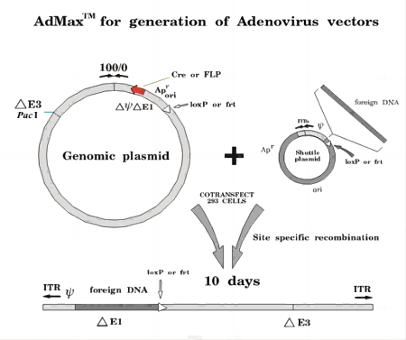 AdMax包裝系統(tǒng)是通過Cre/loxP 獲得重組病毒,這個過程發(fā)生在HEK293細胞中,從而避免在細菌中重組。將克隆了外源基因的腺病毒穿梭質(zhì)粒與攜帶了腺病毒大部分基因組的包裝質(zhì)粒共轉(zhuǎn)染HEK293細胞,利用Cre/loxP系統(tǒng)的作用實現(xiàn)重組,產(chǎn)生重組腺病毒。這個系統(tǒng)有多種優(yōu)勢,包括操作簡便、重組效率高、獲得的病毒產(chǎn)率高、目的基因的表達水平高(因為mCMV啟動子比hCMV啟動子強若干倍)等。