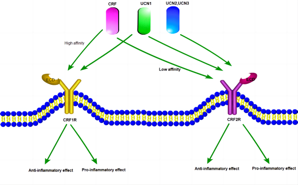 CRF1R和CRF2R主要是通過偶聯(lián)下游Gs蛋白參與體內(nèi)內(nèi)分泌系統(tǒng)、行為系統(tǒng)和免疫系統(tǒng)的壓力應(yīng)答。CRF1R和CRF2R在體內(nèi)被內(nèi)源性配體CRF和UCN1-3 激活。與UCN1對CRF1R和CRF2R都有高親和力不同,CRF對CRF1R的親和力明顯高于CRF2R,而UCN2和UCN3則表現(xiàn)出了對CRF2R選擇性激動劑的活性。
