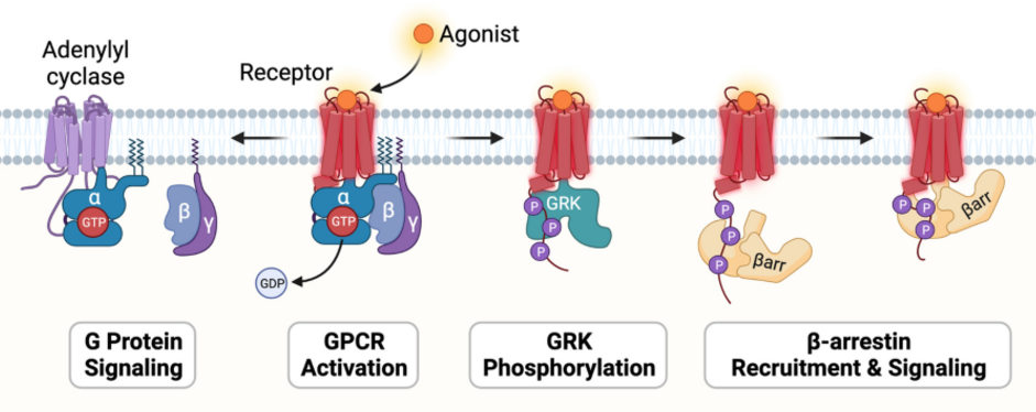 G蛋白偶聯(lián)受體(GPCR)是真核生物中最大,種類最多的膜受體。目前,F(xiàn)DA 批準上市的臨床藥物中,約三分之一的藥物作用于 GPCRs發(fā)揮治療作用,GPCRs 被認為是新藥研發(fā)領(lǐng)域中最重要,也是最有應(yīng)用前景的藥物靶點之一。GPCR 可被多種配體激活,與配體結(jié)合后,GPCR 的構(gòu)象會發(fā)生變化,從而導(dǎo)致特定效應(yīng)蛋白的募集和激活,并觸發(fā)下游信號通路的調(diào)節(jié)。GPCR的下游信號主要由G蛋白和β-arrestin介導(dǎo)。兩種信號之間的平衡可以受到偏向性配體的調(diào)控。偏向性配體選擇性激活某些信號,同時減少或阻止其它信號,為開發(fā)副作用小的藥物提供了方向。