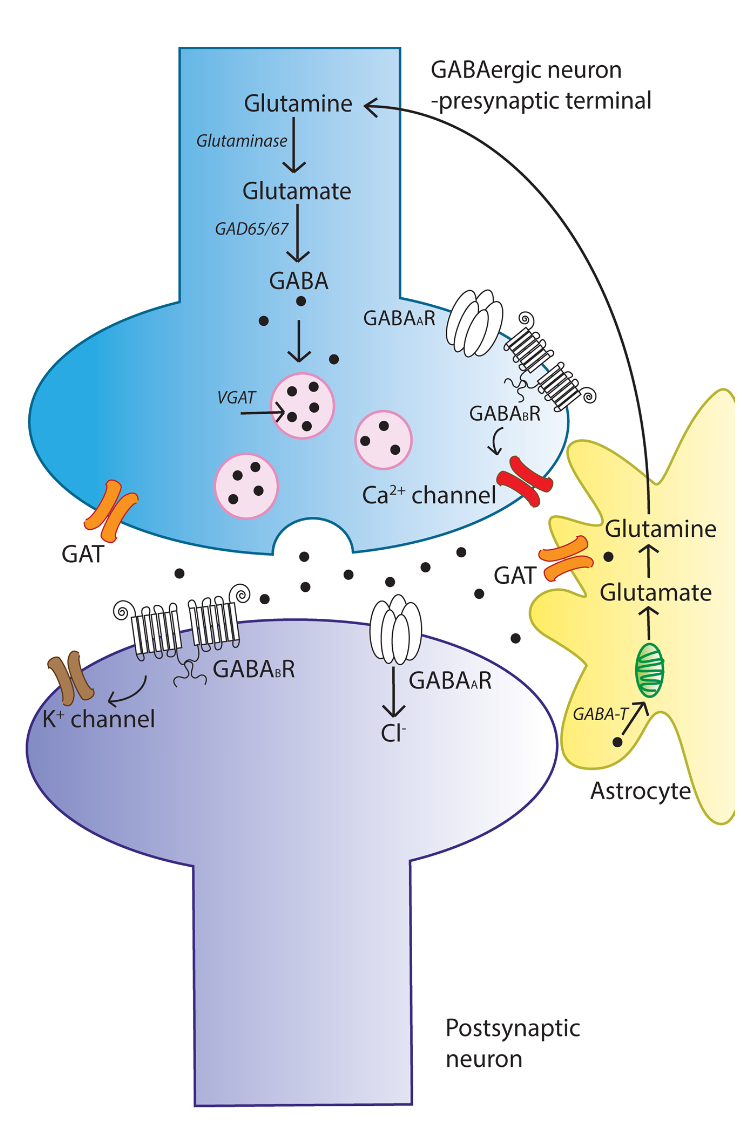GABA的合成是通過谷氨酸酸脫羧酶(GAD)對L-谷氨酸的α-脫羧作用進行的,并依賴于輔酶吡哆醛-5'-磷酸(維生素B6的一種維生素)。GAD存在兩種主要的亞型:65 kDa亞型(GAD65)和67 kDa亞型(GAD67)。GAD65是哺乳動物大腦中表達的GAD的主要亞型,主要定位于突觸體的軸突末端,容易與質(zhì)膜相互作用,而GAD67則更廣泛地分布于細胞的細胞質(zhì)中。兩種GAD亞型的差異分布與細胞內(nèi)兩種GABA的存在相吻合,一種存在于囊泡中,另一種存在于細胞質(zhì)中,它們通過不同的機制釋放。GABA通過囊泡GABA轉(zhuǎn)運蛋白(vGAT)的作用被募集到突觸囊泡中。在膜去極化后,GABA被釋放到突觸中,并可與突觸后膜上的嗜離子性GABA受體(GABAAR)或代謝性GABB受體(GABABR)結(jié)合,從而抑制突觸后神經(jīng)元。釋放的GABA通過膜結(jié)合的GABA轉(zhuǎn)運體(GATs)從突觸中清除,在星形膠質(zhì)細胞中,GABA被循環(huán)進入突觸囊泡或被線粒體吸收,在線粒體中被GABA轉(zhuǎn)氨酶(GABA- t)代謝為谷氨酰胺供神經(jīng)元攝取。