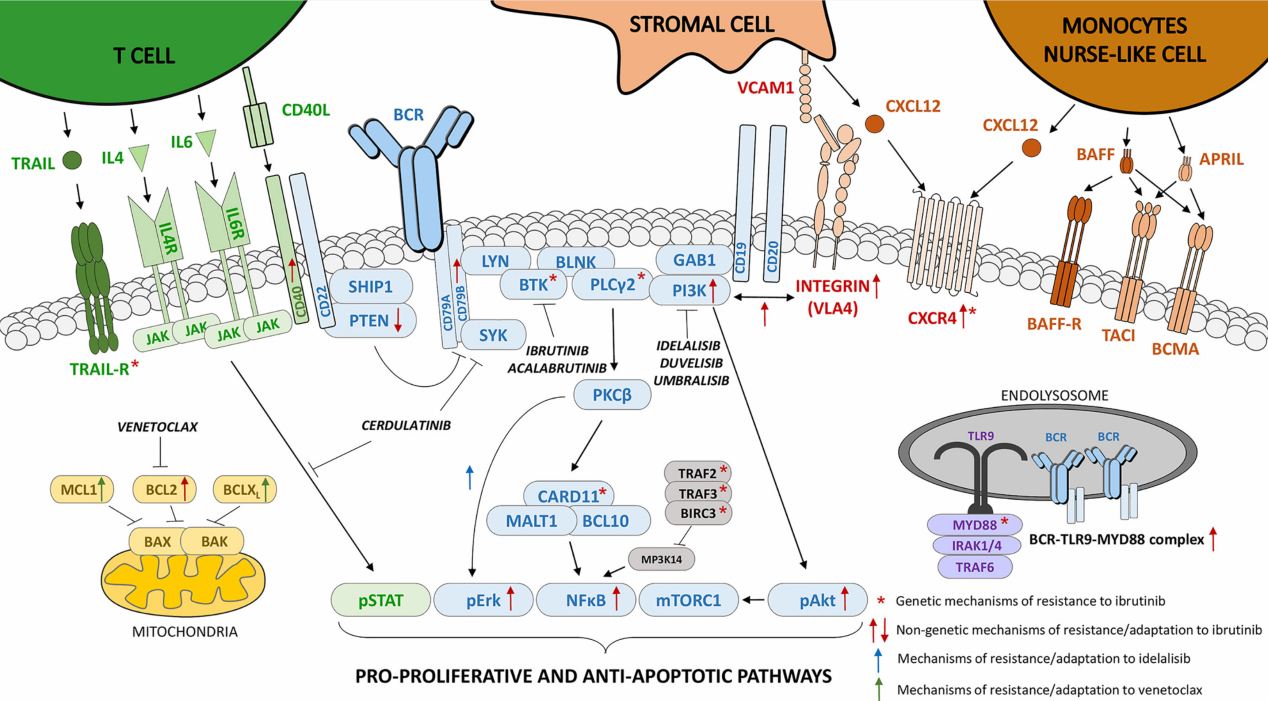 B細(xì)胞受體(BCR)信號通路在成熟B細(xì)胞惡性腫瘤的發(fā)生和進(jìn)展中起著核心作用,例如慢性淋巴細(xì)胞白血病(CLL)、套細(xì)胞淋巴瘤(MCL)、彌漫性大B細(xì)胞淋巴瘤(DLBCL)、濾泡性淋巴瘤(FL)或華氏巨球蛋白血癥(WM)。BCR信號通路中的激活突變常見于DLBCL、FL或WM;而在CLL和MCL中一般會缺失,但BCR信號轉(zhuǎn)導(dǎo)被組成性激活,并且是其發(fā)病機(jī)制的關(guān)鍵參與者。