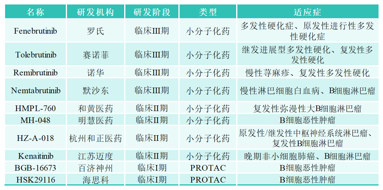 2013年,第一代BTK抑制劑Ibrutinib(伊布替尼)已被批準(zhǔn)用于治療 CLL、MCL、WM 和邊緣區(qū)淋巴瘤 (MZL),它與BTK活性位點(diǎn)的半胱氨酸殘基形成共價鍵,封閉了ATP結(jié)合口袋,從而阻斷BTK的酶活性。雖然它是一種強(qiáng)效藥物,但它存在脫靶效應(yīng),并且相當(dāng)多的患者對治療產(chǎn)生耐藥性或毒性而停止治療。第二代的BTK抑制劑(如Acalabrutinib等)在保持高選擇性的同時,減少了脫靶效應(yīng),提高了安全性和療效。但第一代和第二代的抑制劑都屬于不可逆抑制劑。BTK共價抑制劑治療后常會產(chǎn)生耐藥,部分耐藥機(jī)制為BTK 基因產(chǎn)生耐藥突變導(dǎo)致,其中最常見的耐藥突變?yōu)镃481位的氨基酸突變?yōu)镾。Pirtobrutinib是由禮來研發(fā)的首款獲批上市的非共價的第三代BTK抑制劑,它通過非共價、非C481依賴的結(jié)合阻斷BTK的ATP結(jié)合位點(diǎn),從而克服由C481S導(dǎo)致的共價BTK抑制劑耐藥機(jī)制,另外包括fenebrutinib,Nemtabrutinib等也屬于同一類型的三代非共價抑制劑。除了上述共價或非共價BTK抑制劑外,為了進(jìn)一步提高藥效和克服耐藥,近年來一些藥企也在開發(fā)針對BTK靶點(diǎn)的PROTAC藥物,下表為部分在研的BTK抑制劑以及PROTAC藥物。