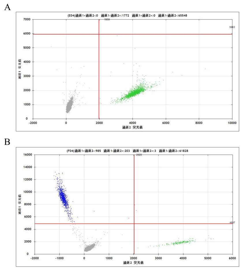 Figure 4:Gene Edited BTK[C481S] Isogenic Cell-ddPCR結(jié)果(通道1 藍(lán)色微滴代表BTK C481S 突變陽性,通道2 綠色微滴代表該位點(diǎn)為陰性野生型)