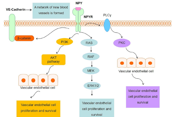 在人類(lèi)中,NPY主要通過(guò)三種GPCR- Y1R、Y2R和Y5R起作用。Y1R需要全長(zhǎng)NPY1-36才能激活,而Y2R和Y5R也可以結(jié)合NPY3-36。所有NPY受體通過(guò)Gi/o蛋白發(fā)出信號(hào),并通過(guò)腺苷酸環(huán)化酶抑制cAMP合成,從而阻斷PKA對(duì)下游通路的抑制作用。NPY信號(hào)傳導(dǎo)的第二種機(jī)制是針對(duì)Y1R和Y2R的,涉及Ca 2 +的動(dòng)員以及隨后PKC和CaMKII的鈣依賴(lài)性激活。同時(shí),這些信號(hào)通路導(dǎo)致ERK1/2的激活。此外,所有NPY受體都能夠激活PI3K/Akt通路。Y5R的具體特征是能夠激活RhoA,從而調(diào)節(jié)細(xì)胞骨架重塑。