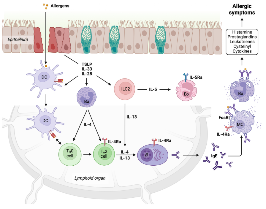 過(guò)敏的病因與Ⅱ型炎癥反應(yīng)密切相關(guān),會(huì)導(dǎo)致過(guò)敏原特異性免疫球蛋白E(IgE)的產(chǎn)生,這是許多過(guò)敏性疾病的關(guān)鍵驅(qū)動(dòng)因素。在高水平上,初始的過(guò)敏原暴露會(huì)破壞上皮的完整性,通過(guò)包括IL-25、IL-33和TSLP在內(nèi)的細(xì)胞因子觸發(fā)局部炎癥,這些炎癥激活Ⅱ型先天淋巴樣細(xì)胞以及其他免疫細(xì)胞來(lái)分泌Ⅱ型細(xì)胞因子IL-4、IL-5和IL-13,促進(jìn)Th2細(xì)胞的發(fā)育和嗜酸性粒細(xì)胞的招募。Th2細(xì)胞依賴(lài)的B細(xì)胞激活促進(jìn)了過(guò)敏原特異性IgE的產(chǎn)生,IgE穩(wěn)定地與嗜堿性細(xì)胞和肥大細(xì)胞表面的Fc段含高親和力受體(FcεRI)結(jié)合。在過(guò)敏原再次暴露后,這些細(xì)胞迅速脫粒導(dǎo)致過(guò)敏癥狀。