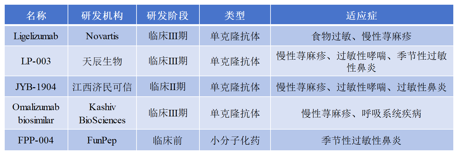2025年3月2日,中國(guó)創(chuàng)新型生物制藥企業(yè)天辰生物醫(yī)藥(蘇州)有限公司公布了其自主研發(fā)的新一代抗IgE抗體LP-003治療慢性蕁麻疹的II期臨床中期數(shù)據(jù)。結(jié)果顯示,LP-003在關(guān)鍵療效指標(biāo)上優(yōu)于現(xiàn)有抗IgE療法奧馬珠單抗,且展現(xiàn)出長(zhǎng)效優(yōu)勢(shì),或?qū)⒊蔀槿蚩笽gE治療領(lǐng)域的顛覆性藥物。據(jù)報(bào)道,Ligelizumab是諾華通過(guò)親和力改造的靶向Ig E的全人源IgG1k單抗,與奧馬珠單抗同為第一代IgE抗體,對(duì)IgE/FcεRI信號(hào)傳導(dǎo)阻滯明顯增強(qiáng)。JYB1904是濟(jì)民可信自主研發(fā)的靶向IgE重組人源化單克隆抗體創(chuàng)新藥,研究結(jié)果顯示其親和力更高,人源化程度更高,具有更優(yōu)的穩(wěn)定性。