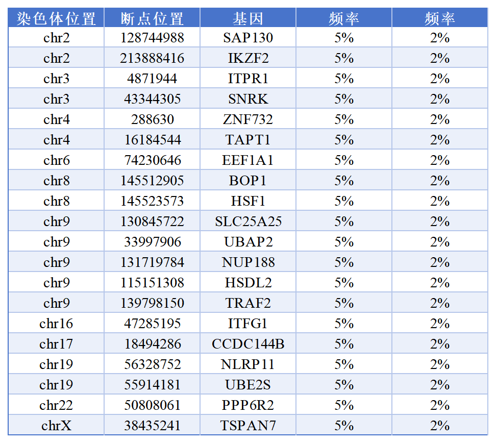 目前檢測ISA的方法有LM-PCR、NGS、單細(xì)胞測序等,為了保證檢測的準(zhǔn)確性,科佰生物開發(fā)了一系列慢病毒整合位點(diǎn)標(biāo)準(zhǔn)品供檢測機(jī)構(gòu)使用,作為品質(zhì)衡量的標(biāo)尺對檢測能力進(jìn)行判別。在前文 慢病毒整合位點(diǎn)標(biāo)準(zhǔn)品強(qiáng)勢來襲一文中,已對單克隆多插入位點(diǎn)單克隆單插入位點(diǎn)、性染色體插入位點(diǎn) 做了產(chǎn)品的說明及數(shù)據(jù)展示。近期科佰推出了5%  2% 整合頻率的慢病毒多克隆多整合位點(diǎn)參考品,由多個(gè)單克隆整合位點(diǎn)產(chǎn)品混合而來,覆蓋20個(gè)插入位點(diǎn),分別來自11個(gè)不同染色體上的20個(gè)基因,如下表所示
