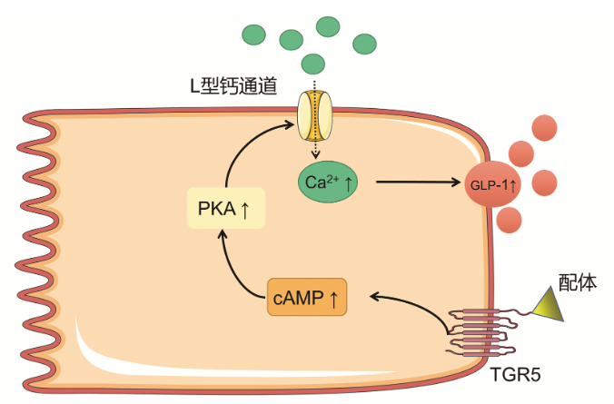 TGR5在維持葡萄糖穩(wěn)態(tài)和胰島素敏感性方面上的效果已得到廣泛證明。例如,使用TGR5激動(dòng)劑6α-乙基-23(S)-甲基-膽酸(6α-ethyl-23(S)-methyl-cholic acid,INT-777)可以提高肥胖小鼠的胰島素敏感性,7-硫酸膽酸以TGR5依賴性方式增加胰島素抵抗小鼠的葡萄糖耐量等。機(jī)體各組織的TGR5可通過不同的分子機(jī)制參與血糖代謝的調(diào)節(jié)。TGR5對于血糖代謝的作用,主要與腸促胰島素釋放相關(guān),通過刺激腸內(nèi)分泌L細(xì)胞分泌GLP-1來實(shí)現(xiàn)。既往研究發(fā)現(xiàn),GLP-1可促進(jìn)胰島素分泌,促進(jìn)胰島β細(xì)胞存活和增殖,抑制細(xì)胞凋亡,并且可有效刺激2型糖尿病患者的胰島素分泌并降低血糖。早期觀點(diǎn)認(rèn)為TGR5被激活后刺激腸內(nèi)分泌L細(xì)胞內(nèi)cAMP水平增加,線粒體氧化磷酸化增加,ATP/ADP比例增加,導(dǎo)致ATP依賴性鉀離子通道(KATP)關(guān)閉,開放鈣離子通道,促進(jìn)鈣離子內(nèi)流,釋放GLP-1。但后續(xù)大量研究驗(yàn)證了GLP-1的分泌確實(shí)與cAMP升高,胞內(nèi)鈣離子升高有關(guān),但與ATP依賴性鉀離子通道無關(guān)。Brighton等的實(shí)驗(yàn)進(jìn)一步驗(yàn)證了GLP-1分泌與L細(xì)胞內(nèi)的cAMP和Ca2+濃度變化有關(guān),并且說明了該作用主要由位于基底外側(cè)L細(xì)胞膜上的TGR5介導(dǎo)。近年來,Goldspink等發(fā)現(xiàn)腸L細(xì)胞上的TGR5被激活后,通過cAMP/PKA途徑,開放了L型Ca2+通道,促進(jìn)Ca2+內(nèi)流,引發(fā)GLP-1分泌。