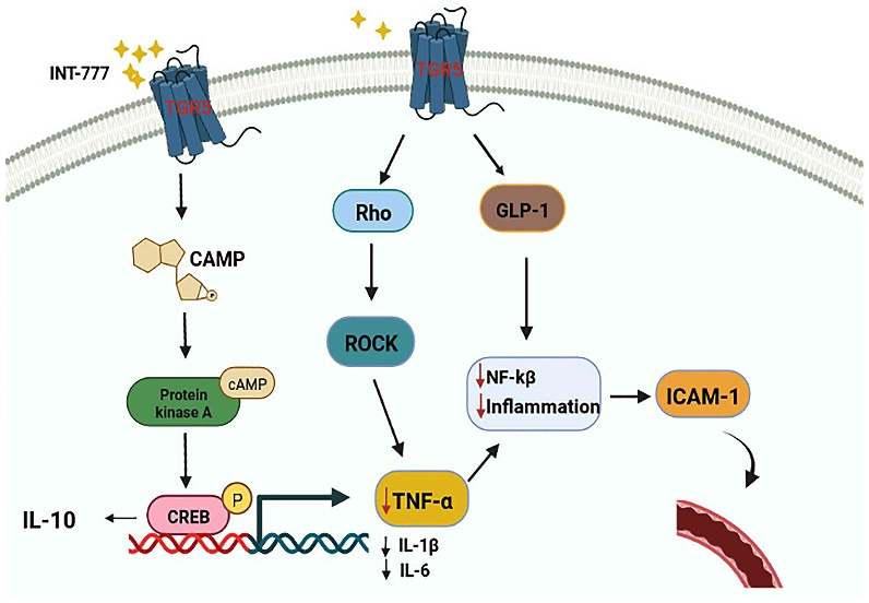 有報(bào)道稱,在慢性炎癥反應(yīng)中,TNF-α可激活多種半胱天冬酶,導(dǎo)致炎癥細(xì)胞凋亡。TGR5已被發(fā)現(xiàn)通過調(diào)節(jié)Rho/Rho相關(guān)蛋白激酶(ROCK)信號通路來調(diào)節(jié)TNF-α。作為TGR5的激動(dòng)劑,INT-777可以阻斷TNF-α誘導(dǎo)的RMEC增殖和遷移,抑制TNF-α促進(jìn)血管通透性的作用。此外,已有證據(jù)表明,TGR5激動(dòng)劑可以通過激活TGR5- camp蛋白激酶A (PKA)信號通路,上調(diào)IL-10的表達(dá),發(fā)揮抗炎和免疫抑制作用,降低促炎細(xì)胞因子IL-1β、IL-6和TNF-α的表達(dá)。有研究表明,GLP-1可通過抑制NF-κB延緩ECs的損傷,進(jìn)而抑制IL-1β、IL-6、TNF-α等炎癥因子的分泌。而各種研究證實(shí)GLP-1是TGR5的靶點(diǎn)之一;其分泌依賴于TGR5。因此,推測激活TGR5可能是刺激GLP-1分泌、延緩RMEC損傷的有效途徑。