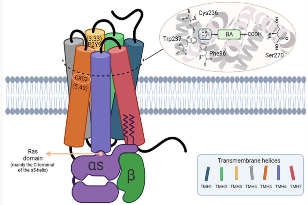 TGR5 受體是第一個(gè)已知的膽汁酸特異性G蛋白偶聯(lián)受體,也被稱為膽汁酸受體 1(GPBAR1),屬于 A 類 G 蛋白偶聯(lián)受體(GPCR)亞家族。該受體由七個(gè)跨膜螺旋(TMH1-7)、三個(gè)胞外環(huán)(ECL1-3)組成,有助于配體結(jié)合,以及三個(gè)胞內(nèi)環(huán)(ICL1-3),參與將信號傳遞給下游信號分子。