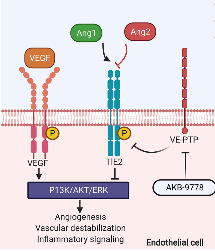 血管生成素蛋白家族由 血管生成素1(Ang1)、血管生成素2(Ang2)、血管生成素3(Ang3) 和血管生成素4(Ang4) 組成。Ang1和Ang2是Tie2的主要配體,Tie2是一種內(nèi)皮細(xì)胞特異性受體酪氨酸激酶。Tie2在血管生成素激活后經(jīng)歷特異性亞細(xì)胞定位。這種定位有助于區(qū)分靜止內(nèi)皮和血管生成內(nèi)皮之間的信號(hào)轉(zhuǎn)導(dǎo)結(jié)果。在運(yùn)動(dòng)的血管生成內(nèi)皮中,基質(zhì)結(jié)合的Ang1與Tie2結(jié)合并將其定位于細(xì)胞-細(xì)胞外基質(zhì)接觸,并繼續(xù)進(jìn)行細(xì)胞遷移和增殖過(guò)程。在靜止內(nèi)皮中,Ang1/Tie2 信號(hào)轉(zhuǎn)導(dǎo)將匯合內(nèi)皮細(xì)胞上的Tie2轉(zhuǎn)位到內(nèi)皮細(xì)胞-內(nèi)皮細(xì)胞連接處的簇中,并誘導(dǎo)促存活、內(nèi)皮緊密連接穩(wěn)定和抗炎信號(hào)。這主要是通過(guò)下游募集和激活PI3K以及隨后的Akt磷酸化來(lái)實(shí)現(xiàn)的。Akt信號(hào)轉(zhuǎn)導(dǎo)通過(guò)上調(diào)促存活分子(包括磷酸化內(nèi)皮一氧化氮合酶(eNOS) 和存活素表達(dá))來(lái)促進(jìn)內(nèi)皮細(xì)胞存活,同時(shí)抑制凋亡途徑,例如 caspase-9 和 B 細(xì)胞淋巴瘤 2 (BCL2) 相關(guān)細(xì)胞死亡激動(dòng)劑 (BAD)。