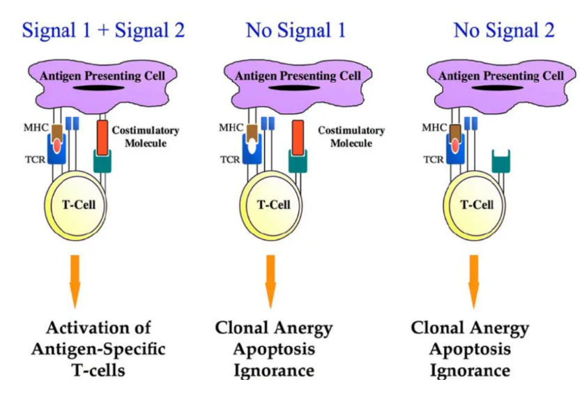 但僅有信號(hào)1無(wú)法有效激活T細(xì)胞的免疫反應(yīng),還需要足夠的共刺激信號(hào)(信號(hào)2)。信號(hào)2不是抗原特異性的,而是通過抗原呈遞細(xì)胞上表達(dá)的共刺激信號(hào)分子和T細(xì)胞的相互作用而實(shí)現(xiàn)的。共刺激信號(hào)對(duì)于T細(xì)胞的增殖,分化和存活是必要的。如果沒有共刺激信號(hào),可能會(huì)出現(xiàn)T細(xì)胞無(wú)應(yīng)答/應(yīng)答低下,細(xì)胞死亡或者會(huì)有免疫耐受的情況。