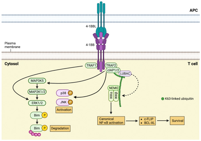 4-1BB的配體是4-1BBL(也稱為TNFSF9或CD137L)。4-1BBL是TNF超家族的II型膜蛋白。在與抗原呈遞細(xì)胞(APC)上的 4-1BBL 相互作用后,4-1BB 信號(hào)傳導(dǎo)首先將TRAF1和TRAF2與cIAP1和cIAP2一起募集到位于 4-1BB 細(xì)胞質(zhì)尾部的 TRAF 結(jié)合基序,形成 4-1BB 信號(hào)復(fù)合物。TRAF1 和 TRAF2 通過 TRAF1 刺激 ERK1/2 活性導(dǎo)致 ERK1/2 激活。ERK1/2 的激活還誘導(dǎo)促細(xì)胞凋亡蛋白 Bim 的磷酸化,使Bim的蛋白酶體降解,進(jìn)而促進(jìn)了 T 細(xì)胞存活。在 4-1BB 誘導(dǎo)的 NF-κB 激活的背景下,TRAF2-cIAP 復(fù)合物啟動(dòng) NF-κB 通路。IKK 復(fù)合物由三個(gè)亞基組成:兩個(gè)激酶 IKKα 和 IKKβ,以及調(diào)節(jié)亞基 NF-κB 必需調(diào)節(jié)劑 (NEMO;也稱為 IKKγ)。NF-κB誘導(dǎo)BCL-XL、BCL-2和c-FLIP的轉(zhuǎn)錄,刺激IL-2、IL-4和IFN-γ的表達(dá),促進(jìn)T細(xì)胞的存活和細(xì)胞毒性活性。此外,TRAF2 募集促進(jìn) JNK 和 p38 MAPK 通路的激活。JNK 易位到細(xì)胞核中,與轉(zhuǎn)錄因子 JUN 和 ATF2 相互作用,導(dǎo)致 T 細(xì)胞產(chǎn)生 IL-2、IL-4 和 IFN-γ。