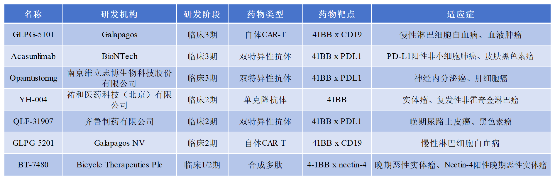 關(guān)于4-1BB在研的部分藥物進(jìn)展如下表所示: