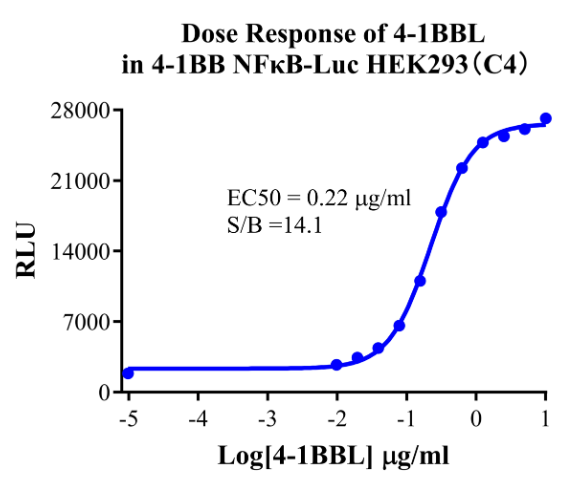 Figure 6. Detect Luciferase assay by Ultra Luciferase Detection Kit CBPH0001(we strongly suggest to purchase from Cobioer). Dose Response of 4-1BBL in 4-1BB NF-κB-Luc HEK293(C4).