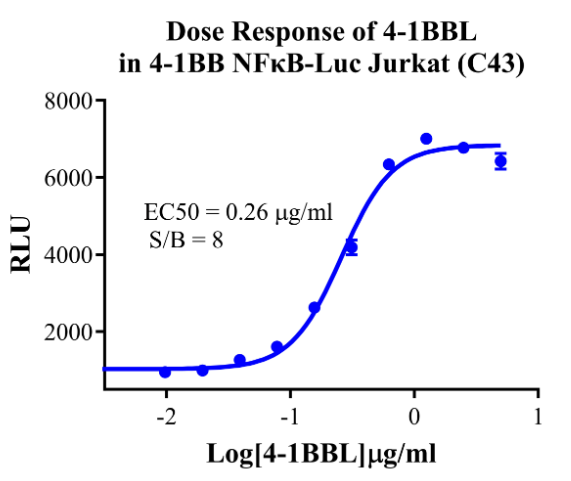 Figure 8. Detect Luciferase assay by Ultra Luciferase Detection Kit CBPH0001(we strongly suggest to purchase from Cobioer). Dose Response of 4-1BBL in 4-1BB NFκB-Luc Jurkat (C43).