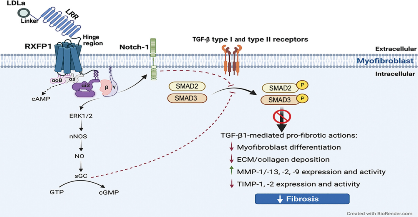 RXFP1 一種 C 型 LGR 相關(guān) GPCR,含有由多個(gè)細(xì)胞外基序組成的約 400 個(gè)氨基酸的大細(xì)胞外區(qū)域,包括富含亮氨酸的重復(fù)結(jié)構(gòu)域(LRR)和低密度脂蛋白 A 類 (LDLa) 模塊,它們通過(guò)連接子區(qū)域連接。RXFP1在其 LRR 相關(guān)胞外結(jié)構(gòu)域內(nèi)激活,引發(fā)受體的構(gòu)象變化,然后允許其 7TM 結(jié)構(gòu)域的細(xì)胞外環(huán)內(nèi)低親和力結(jié)合位點(diǎn)的相互作用和激活,這由其連接子區(qū)域促進(jìn)。受體的連接子區(qū)域在配體結(jié)合時(shí)穩(wěn)定受體構(gòu)象方面起著關(guān)鍵作用,并將殘基定位在連接子區(qū)域和 LDLa 模塊內(nèi)以與 7TM 結(jié)構(gòu)域結(jié)合并激活受體。然后,該作用使 LDLa 模塊能夠充當(dāng)系留激動(dòng)劑,并在配體結(jié)合時(shí)引導(dǎo)受體信號(hào)傳導(dǎo)。位于 RXFP1 C 末端的鉸鏈區(qū)域在受體激活時(shí)也會(huì)發(fā)生構(gòu)象和增加暴露,以誘導(dǎo) G 蛋白 (Gαs, GαOB, Gαi3和 Gβγ) 活動(dòng)。在肌成纖維細(xì)胞中,這導(dǎo)致 cAMP 短暫升高,但 pERK1/2 增加更持久,nNOS-NO-sGC-cGMP 活性因 RXFP1-ERK1/2 依賴性增加。RXFP1-pERK1/2-nNOS-NO-sGC-cGMP 依賴性途徑的激活或肌成纖維細(xì)胞直接激活 cGMP 然后抑制 SMAD2 和 SMAD3 水平的 TGF-β1 信號(hào)轉(zhuǎn)導(dǎo),從而抑制 TGF-β1 促進(jìn)肌成纖維細(xì)胞分化和肌成纖維細(xì)胞誘導(dǎo)的 ECM/膠原蛋白合成和沉積的能力。RXFP1 激活還可以調(diào)節(jié) Notch-1 依賴性信號(hào)傳導(dǎo),以抑制肌成纖維細(xì)胞中的 TGF-β1/SMAD3 軸。此外,RXFP1-pERK1/2-nNOS-NO-sGC-cGMP依賴性途徑的激活導(dǎo)致ECM降解MMP的表達(dá)和活性增加(當(dāng)TGF-β1活性上調(diào)時(shí)通常受到抑制),以及TIMP的活性降低,這將促進(jìn)MMP誘導(dǎo)的已建立ECM/膠原沉積的分解,并有助于減少纖維化進(jìn)展。