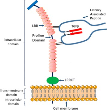 GARP 基因位于人類染色體 9q34.3,GARP蛋白(也稱為 LRRC32)是一種約78 kDa的 I 型跨膜蛋白,由 662 個氨基酸組成,屬于亮氨酸富集重復序列(LRR)家族。GARP蛋白根據(jù)其一級序列在結構上分為三個結構域:細胞外結構域、跨膜結構域和細胞內結構域。細胞外結構域包含兩組 10 個 LRR,由一個富含脯氨酸的結構域和一個 C 端 LRR (LRRCT) 分隔。兩個保守的Cys殘基(Cys-192和Cys-331)分別位于第7和第12個LRR,負責潛在TGF-β的GARP和LAP的Cys-4之間形成兩個二硫鍵。