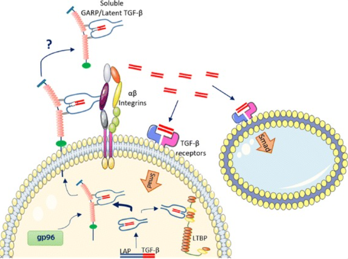 LTGF-β 是前體 TGF-β(pro-TGF-β)與潛伏相關肽(LAP)形成的復合物,TGF-β以無活性的同源二聚體前體蛋白形式合成,經(jīng)由類似于弗林蛋白酶的蛋白酶切割后形成LTGF-β 。GARP 能增強弗林蛋白酶依賴性切割,并與LTGF-β 結合。內質網(wǎng)腔內的主要伴侶蛋白 gp96 確保 GARP 的正確折疊及其在細胞表面的表達。在細胞表面,GARP/LTGF-β復合物與α-β整合素(αVβ6 和αVβ8)結合,釋放成熟的 TGF-β 肽。成熟的 TGF-β 以自分泌和旁分泌的方式與細胞表面的 TGF-β 受體相互作用。在某些情況下,GARP/LTGF-β復合物也可以從細胞表面釋放,但如何從可溶性復合物中激活 TGF-β 尚不清楚。