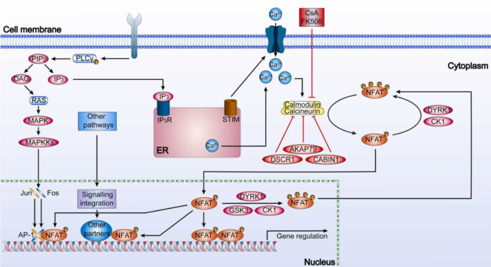 當(dāng)NFAT蛋白在SRR和SP區(qū)域的絲氨酸殘基上被強(qiáng)烈磷酸化時(shí),這些蛋白被限制在細(xì)胞質(zhì)中。細(xì)胞表面受體如T細(xì)胞受體(TCR)、受體酪氨酸激酶(RTKs)和G蛋白偶聯(lián)受體(GPCRs)的激活,引發(fā)信號(hào)級(jí)聯(lián)反應(yīng)。磷脂酶C(PLC)被激活。活化PLC催化了磷脂酰肌醇-4,5-雙膦酸鹽(PIP2)的水解,生成哧啶醇-1,4,5-三磷酸(IP3)和二酰甘油(DAG)。IP3與內(nèi)質(zhì)網(wǎng)表面的IP3R結(jié)合,導(dǎo)致內(nèi)質(zhì)網(wǎng)向細(xì)胞質(zhì)短暫的鈣離子流出,短暫地提高細(xì)胞質(zhì)中的鈣水平,但減少內(nèi)質(zhì)網(wǎng)的鈣儲(chǔ)備。儲(chǔ)備鈣的消耗導(dǎo)致內(nèi)質(zhì)網(wǎng)上的鈣感應(yīng)器STIM形成寡聚體,并遷移至內(nèi)質(zhì)網(wǎng)-質(zhì)膜連接處,在那里它們結(jié)合并激活質(zhì)膜上的Orai(CRAC通道)。Orai形成四聚體通道,開啟持續(xù)的低振蕩性鈣流入,與細(xì)胞質(zhì)中的鈣傳感器鈣調(diào)素(CAM)結(jié)合,形成鈣/鈣調(diào)蛋白/鈣神經(jīng)素復(fù)合物,激活鈣神經(jīng)素。鈣化神經(jīng)素具有催化基(CnA)和調(diào)控亞基(CnB)?;罨腃nA脫磷酸化NFAT蛋白并揭露其NLSs,從而實(shí)現(xiàn)核易位。