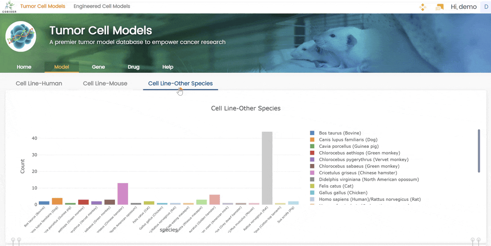 3.訪問并查看"細胞系-其他物種"下所有細胞系模型的基本信息。