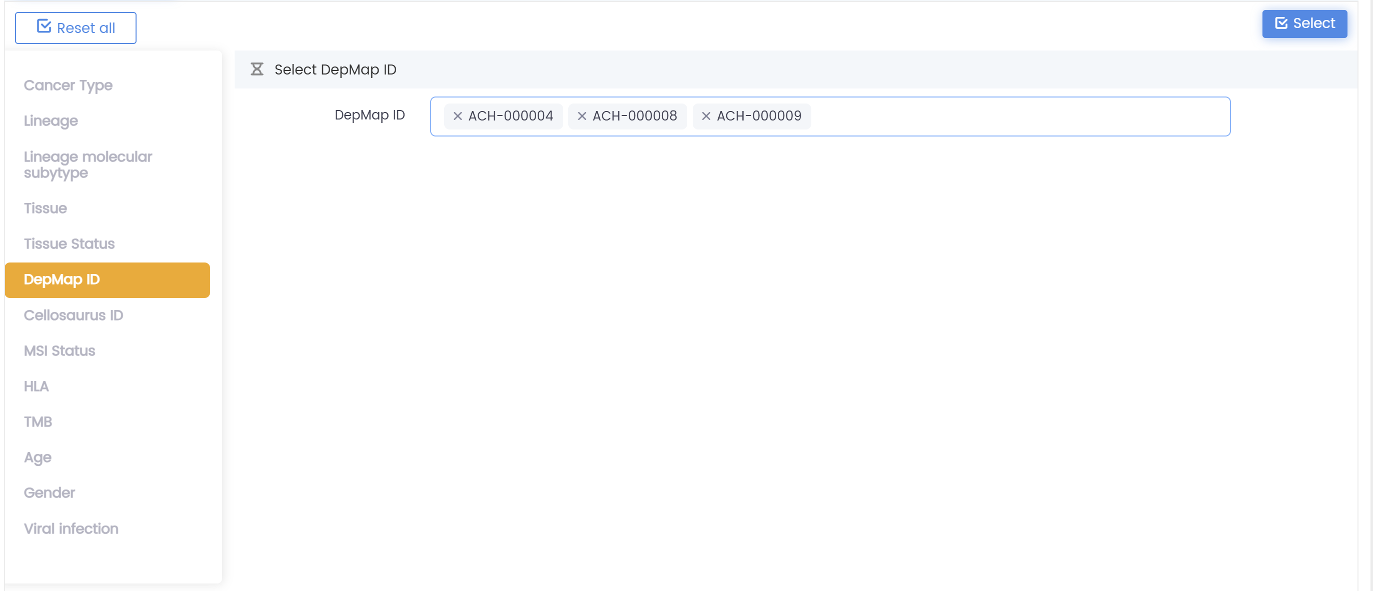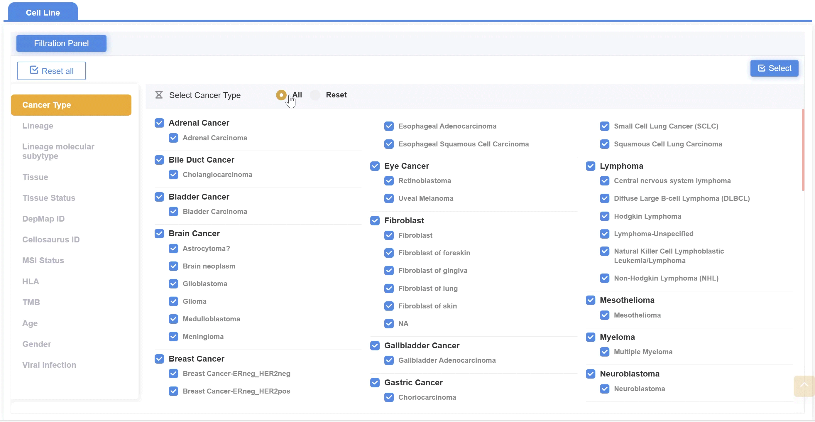 2.按癌癥類型、譜系、亞型、組織、性別、年齡、病毒感染及其他相關(guān)因素篩選樣本。默認選中所有癌癥類型。點擊“重置”重新選擇,隨后點擊右上角的“選擇”按鈕確認篩選條件。