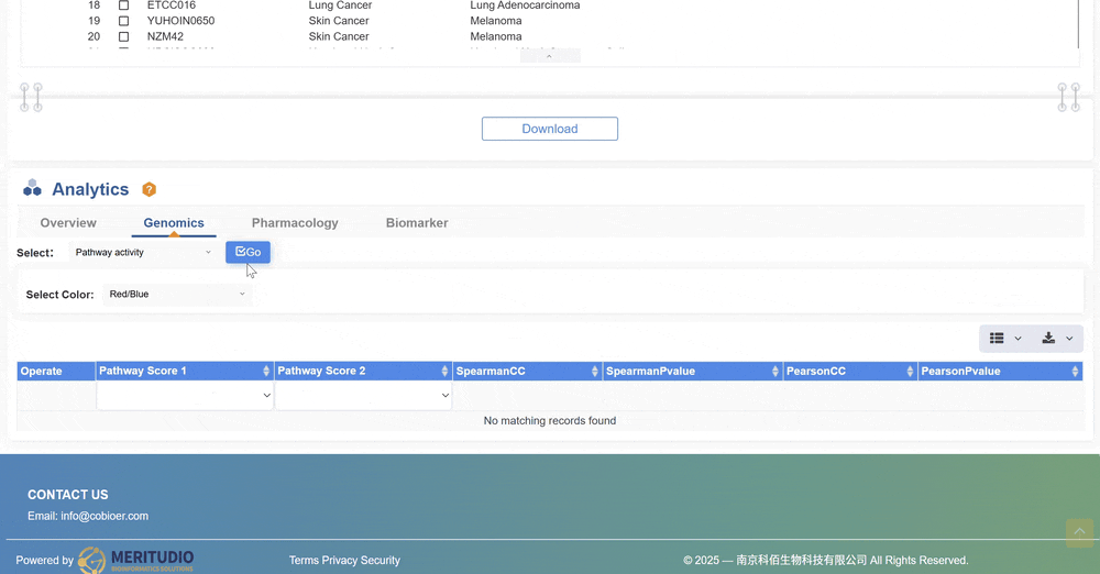 5.為更清晰地展示功能特性,我們已選取所有癌癥類型的細胞系進行展示。詳細信息以靈活表格形式呈現(xiàn),您可添加各類通路活性評分,并按模型、癌癥類型及其他標準進行篩選。所有數(shù)據(jù)均可查看與下載。