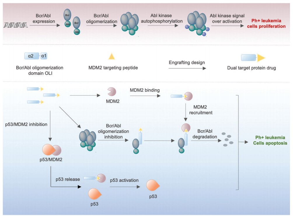 Bcr/Abl在費城染色體陽性(Ph+)白血病中起著核心作用,因為它構成激活Abl酪氨酸激酶及其下游通路。目前,使用酪氨酸激酶抑制劑對伊馬替尼耐藥患者的臨床治療受到耐藥性和不良反應的嚴重限制。在本研究中,通過將MDM2/p53抑制肽序列移植到Bcr/Abl四聚化結構域,設計了一種雙靶向蛋白水解靶向嵌合體(PROTAC)蛋白藥物,稱為PMIBcr/Abl-R6。PMIBcr/Abl-R6具有Bcr/Abl靶向序列和MDM2結合序列,在Ph+白血病細胞中作為PROTAC藥物。其雙靶向結構表明,PMIBcr/Abl-R6設計靶向四聚化結構域而不是Abl激酶結構域,因此有可能克服激酶結構域的耐藥突變。PMIBcr/Abl-R6的有效能力可以同時誘導Bcr/Abl降解并激活p53通路。PMIBcr/Abl-R6具有通過多種機制克服Ph+白血病的耐藥性的潛力。