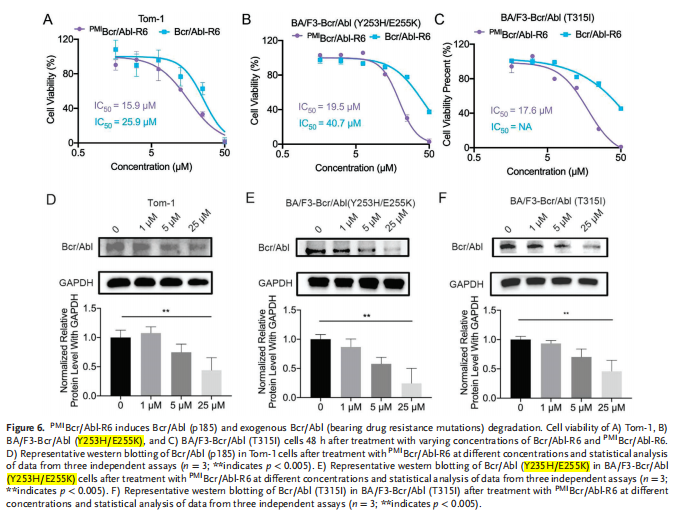 科佰生物為客戶提供了BCR-ABL1 [Y253H/E255K]/BaF3(貨號CBP73326)和BCR-ABL1 [T315I]/BaF3(貨號CBP73190)產品,幫助客戶在細胞活性測定中對其細胞活力測定,判斷PMIBcr/Abl-R6對細胞的殺傷能力和降解能力,通過對不同濃度的PMIBcr/Abl-R6處理的細胞系代表性蛋白印跡的測定與分析,從而助力研究過程中PMIBcr/Abl-R6誘導Bcr/Abl p185和外源性表達的Bcr/Abl攜帶耐藥性突變。