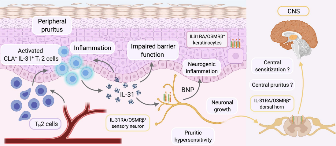 CLA T2細胞是特應(yīng)性皮炎(AD)患者循環(huán)中豐富的過敏原反應(yīng)性T細胞,通過CCL17和CCL22信號被募集到AD感染的皮膚。在皮膚中,CLA T2細胞分泌IL-31,進而激活表達IL31RA/ OSMR β-的皮膚感覺神經(jīng)、天然免疫細胞(包括DC)、單核細胞和嗜酸性粒細胞以及角質(zhì)形成細胞。在AD皮膚中,角質(zhì)形成細胞顯示IL31RA/OSMRβ表達水平升高,導(dǎo)致對IL-31的接受性增強。皮膚IL-31信號通過IL-31介導(dǎo)的終分化基因(如聚絲蛋白和脂質(zhì)包膜減少)的抑制,導(dǎo)致外周瘙癢、(神經(jīng))炎癥和屏障功能受損。活化的角質(zhì)形成細胞分泌各種化學(xué)引誘劑,觸發(fā)表達IL -31的CLA Tu2細胞額外募集到炎癥部位,形成皮膚炎癥和瘙癢的反饋循環(huán)。人和犬的感覺神經(jīng)元表達IL31RA/ OSMRβ主要在TRPV1共表達的神經(jīng)元中。IL-31與IL31RA/ OSMR β結(jié)合后,通過下游信號通路上調(diào)瞬時受體電位香草酸受體1(tansient receptor potential vanilloid,TRPV1)及瞬時受體電位受體A1(TRPA1)表達,增強神經(jīng)元興奮性,促進晚期及慢性瘙癢形成。